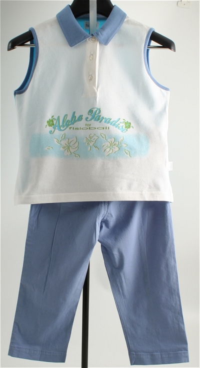 Completo corto di BALDUCCI bianco/carta da zucchero da ragazza composto da un pinocchietto in stretch (ossia tela di cotone elasticizzata) color carta da zucchero e da una polo bianca senza maniche con stampa e rifiniture color carta da zucchero abbinate al pinocchietto.