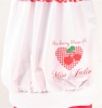 Completo leggings 3 pezzi da bimba composto da: un leggings in jersey di cotone elasticizzato rosso tinta unita con piccola arricciatura al fondo, e un mini abito/maxi t-shirt senza manica, con carrè tessuto rosso a quadretti bianchi con una piccola spilla a motivo floreale sul davanti e il resto bianco con stampa in rosso in fondo sul lato sinistro e da una t-shirt bianca manica corta completare l'insieme.