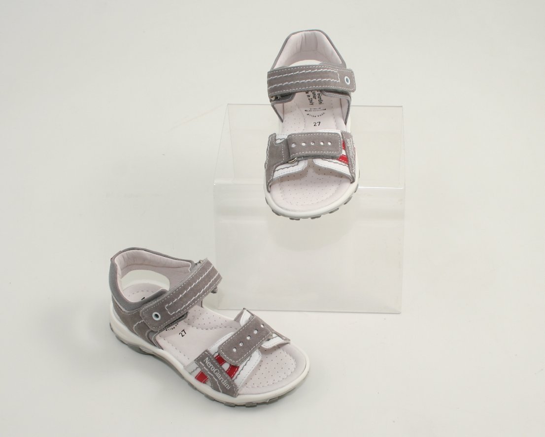Sandalo primavera/estate di Nero Giardini Junior, in camoscio grigio fumo chiaro, modello con cinturino al collo del piede e fascia sul davanti con piccoli trafori sul davanti della tomaia. Inserti in pelle bianca e rossa e in tessuto tecnico grigio fumo con impunture a contrasto.Foderato in vera pelle. Suola a spessore differenziato, flessibile, reattiva e antiscivolo in gomma. Chiusura con velcro che regola anche la larghezza della falda sul davanti per una migliore portabilità. Sandalo made in Italy, sinonimo di materiali di pregio e qualità tipici italiani e precisamente del grande bacino calzaturiero marchigiano dove è allocata la sede di Nero Giardini.