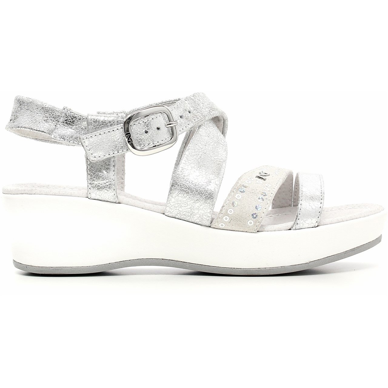 Sandalo primavera/estate di Nero Giardini Junior, in camoscio ghiaccio e pelle argento, modello con cinturino al collo del piede e doppia fascia sul davanti con piccole paillettes sulla fascia in camoscio. Foderato in vera pelle. Suola con plateau a spessore differenziato, flessibile, reattiva e antiscivolo in gomma. Sandalo made in Italy, sinonimo di materiali di pregio e qualità tipici italiani e precisamente del grande bacino calzaturiero marchigiano dove è allocata la sede di Nero Giardini.