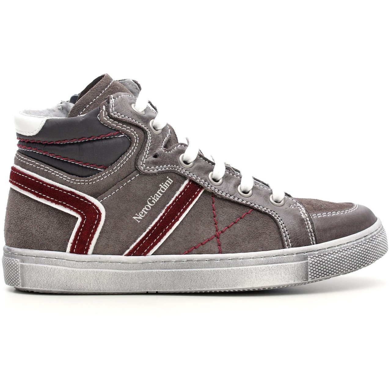 Sneakers alto autunno/inverno di Nero Giardini Junior da ragazzo in crosta scamosciata (pelle la cui superficie sembra simile al velluto) e inserti in pelle color grigio grafite, con dettagli in crosta scamosciata e impunture bordeaux, stringhe sul davanti e cerniera sul lato interno secondo gli ultimi dettami della moda. Foderata in capretto. Scarpina made in Italy, sinonimo di materiali di pregio e qualità tipici italiani e precisamente del grande bacino calzaturiero marchigiano dove è allocata la sede di Nero Giardini.