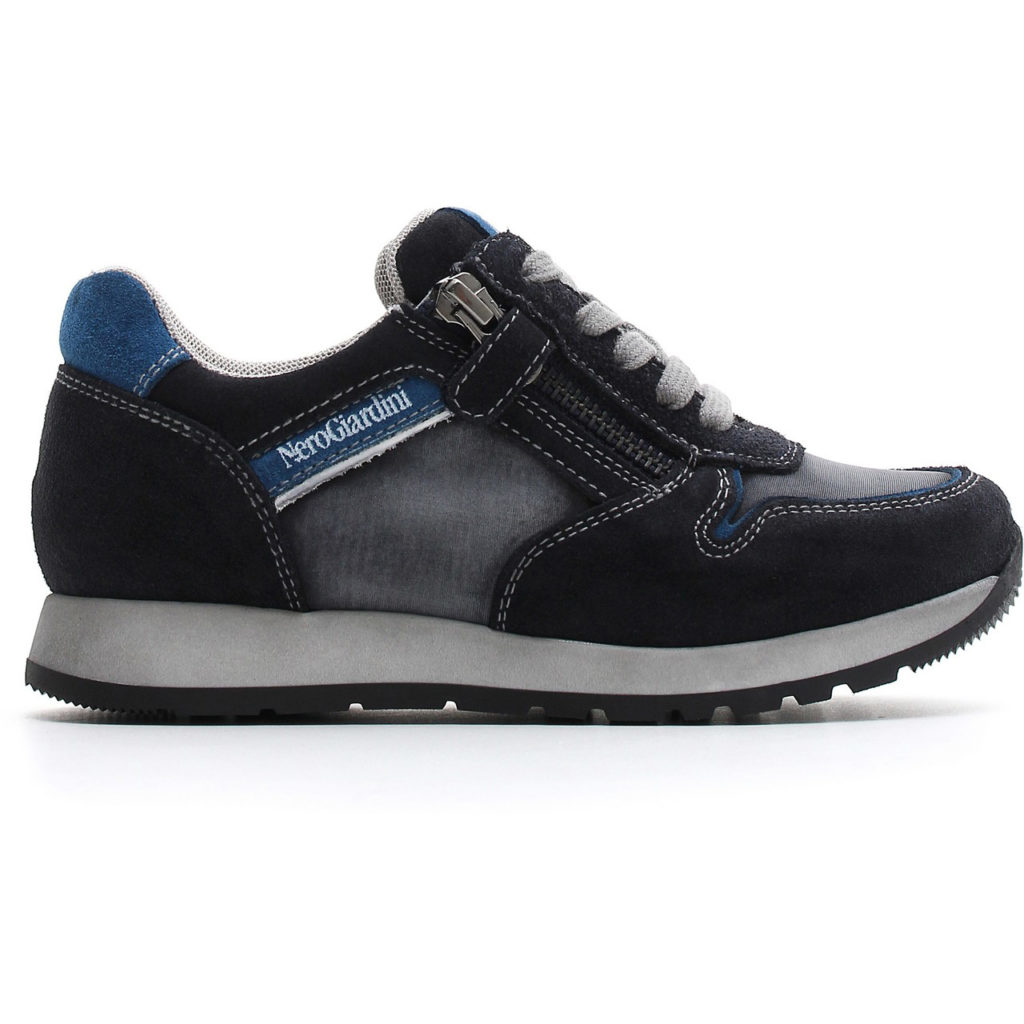 Sneakers bassa autunno/inverno di Nero Giardini Junior in camoscio e tessuto tecnico color blu. Foderata in tessuto tecnico, chiusura con lacci e cerniera per una migliore calzabilità. Suola in gomma a spessore differenziato, flessibile, reattiva e antiscivolo. Scarpina made in Italy, sinonimo di materiali di pregio e qualità tipici italiani e precisamente del grande bacino calzaturiero marchigiano dove è allocata la sede di Nero Giardini.
