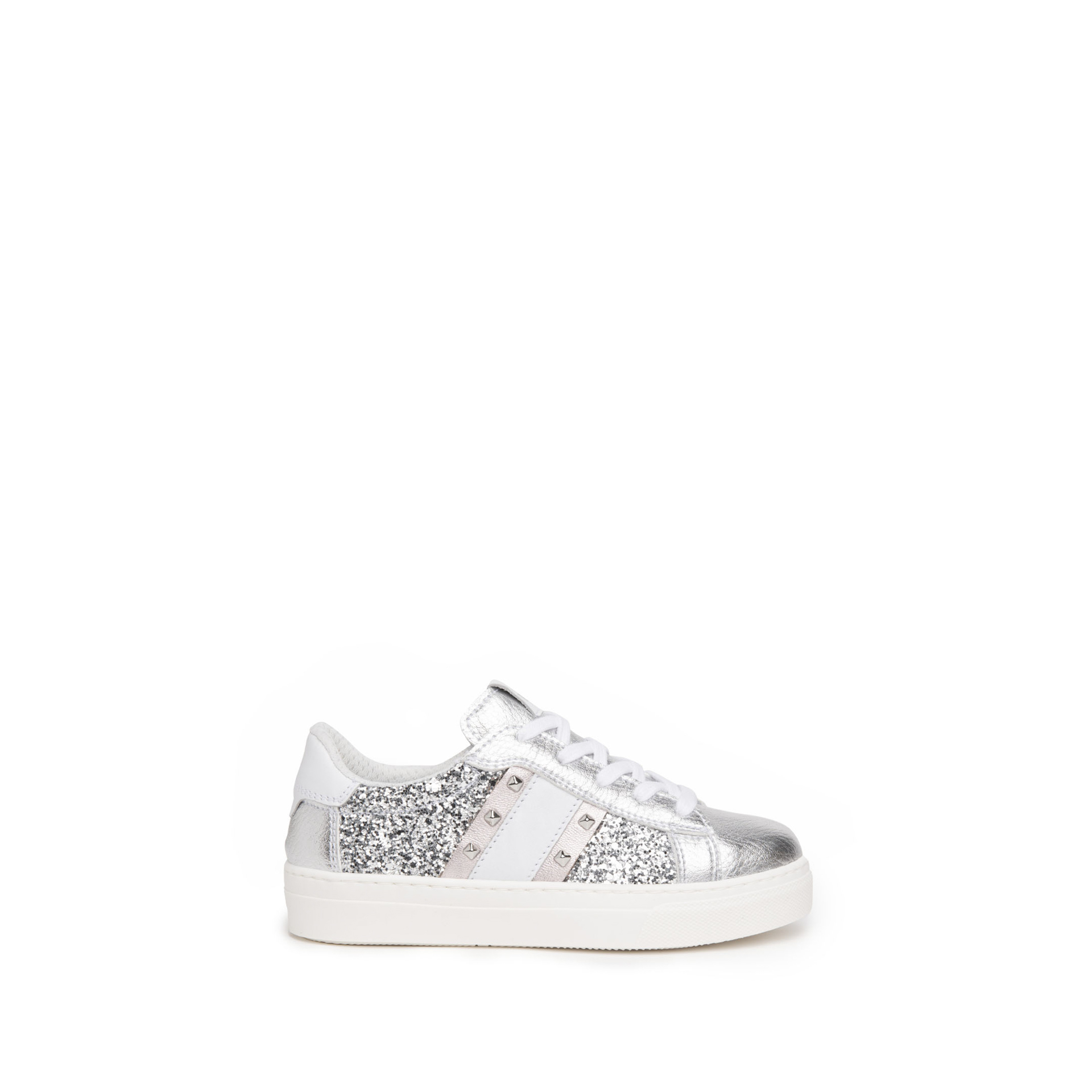 Sneakers da ragazza primavera estate di Nero Giardini Junior realizzata in Italia con materiali di qualità e testati in laboratorio. Continua ricerca stilistica per trend nuovi e originali. Il sottopiede con tecnologia DryGol® assorbe l'umidità e garantisce confort e benessere. Modello in pelle e materiale tecnico con inserti glitterati, laminati e borchie. Comoda chiusura stringata con zip e lacci, fondo box ultraleggero