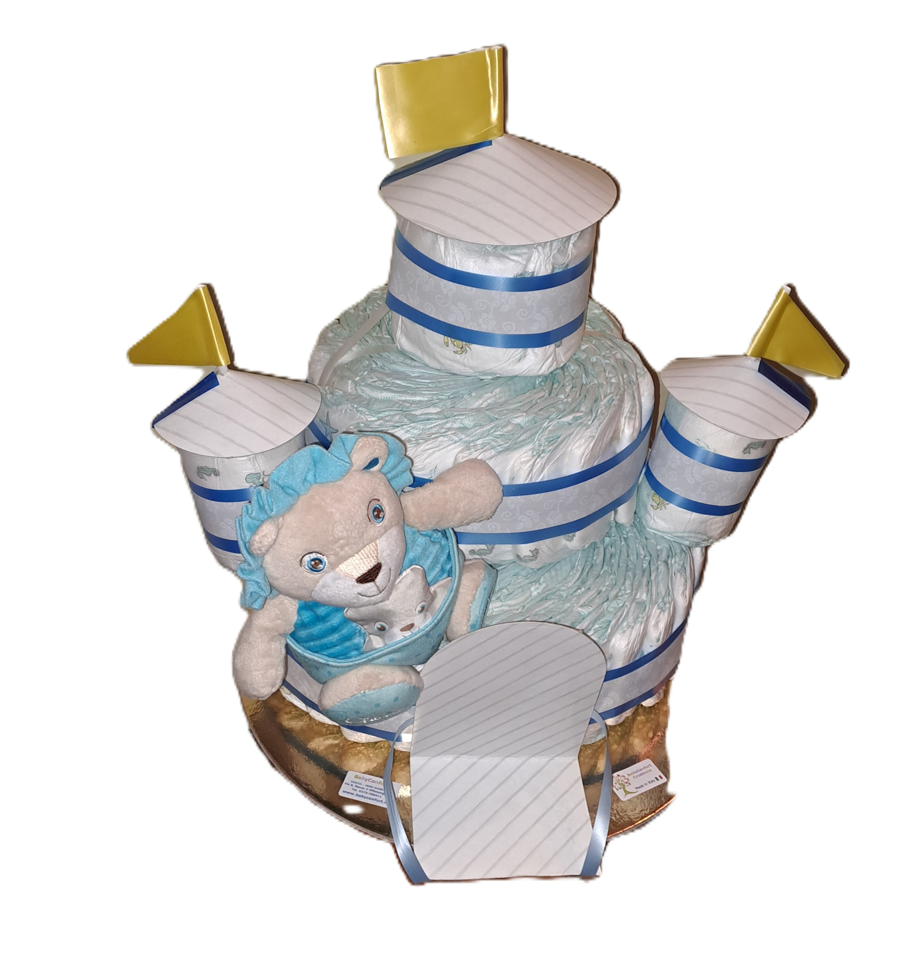 Originale Torta di Pannolini a forma di castello con pupazzo e prodotti